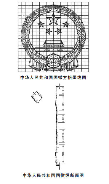 五、國徽之涂色為金紅二色:麥稻、五星、天安門、齒輪為金色,圓環(huán)內(nèi)之底子及垂綬為紅色;紅為正紅(同于國旗),金為大赤金(淡色而有光澤之金)。